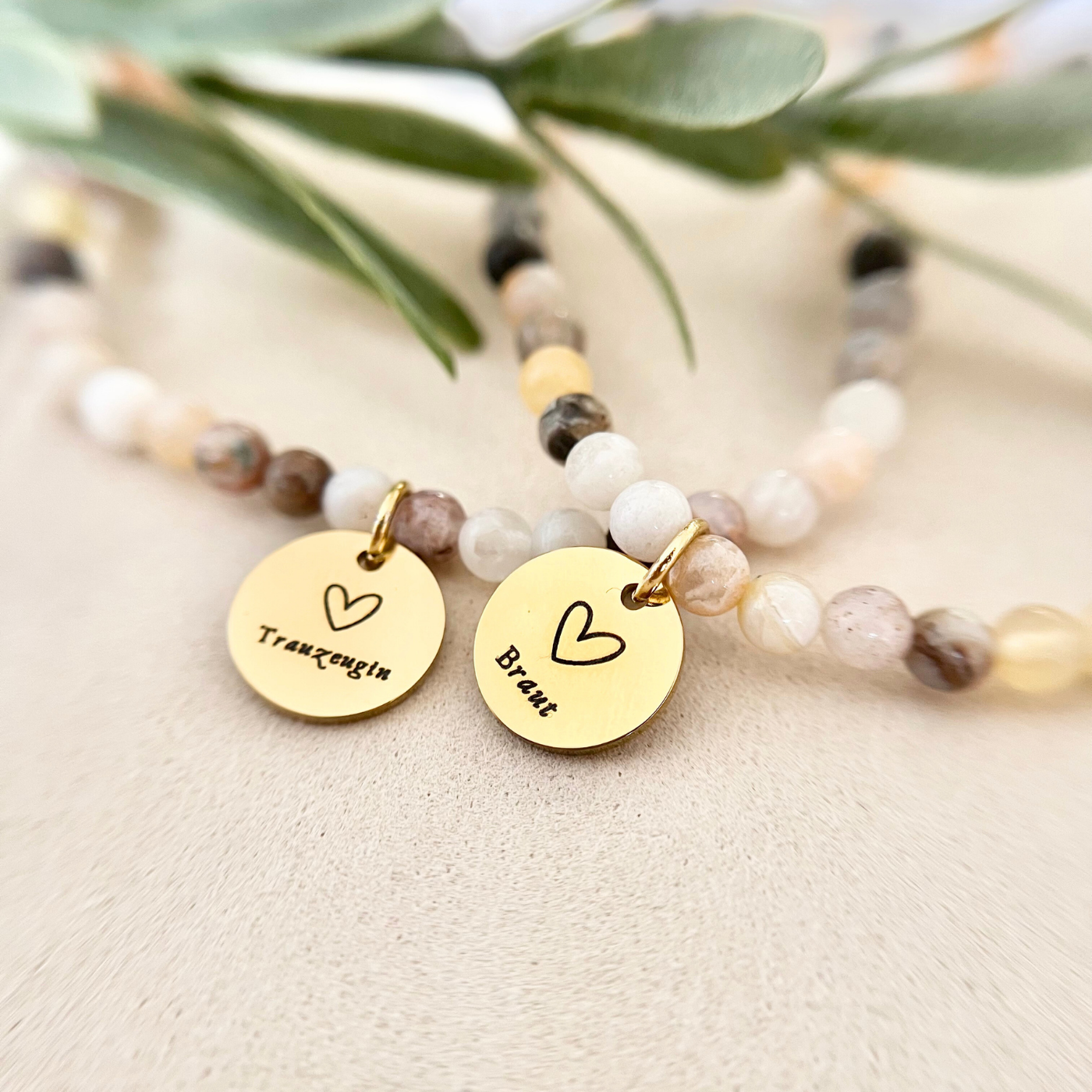 Die beiden aufeinander abgestimmten Natursteinperlenarmbänder überzeugen durch ihre ruhigen, alltagstauglichen Farben in Weiß-, Beige- und Braunnuancen. Ergänzt werden sie durch hochwertige Gravur-Anhänger und einen edlen Schmuckbeutel – perfekt, um die Trauzeugin zu fragen oder Danke zu sagen.