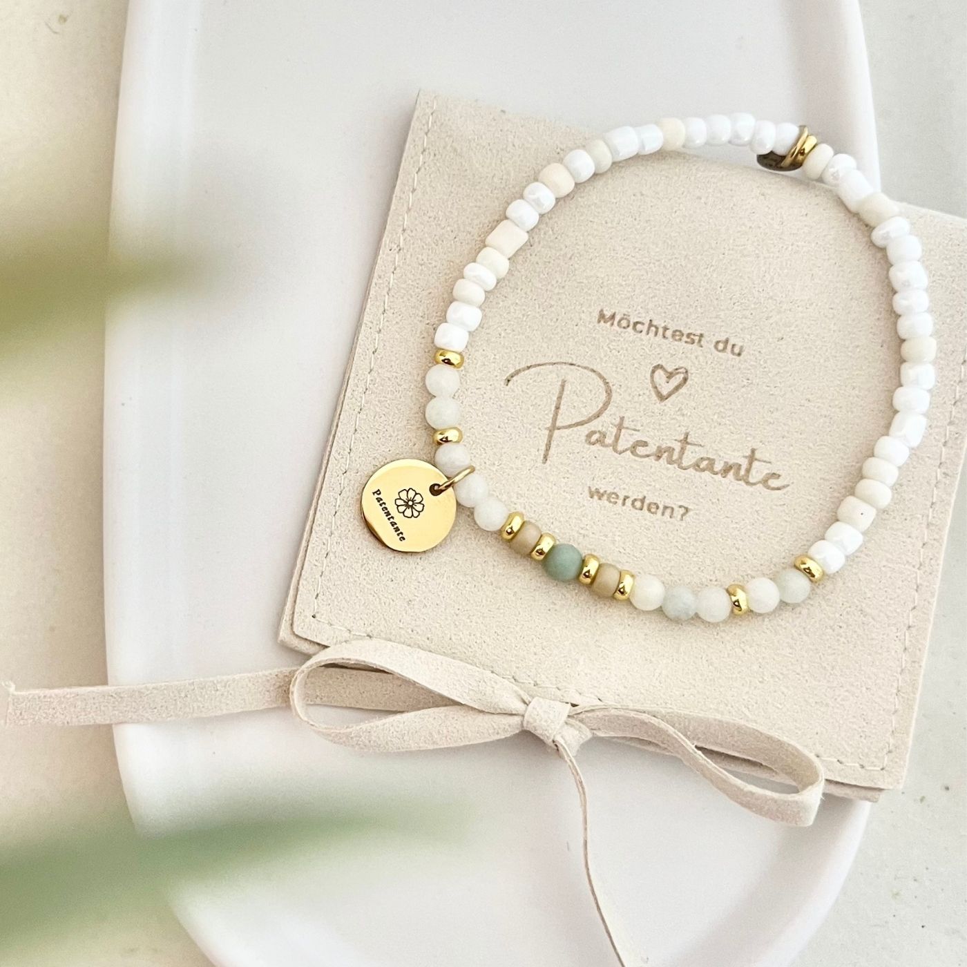 Das Armband ist liebevoll in einem weichen Schmuckbeutel verpackt und wird durch einen Gravuranhänger mit der Aufschrift „Patentante“ und einer kleinen Blume zu einem ganz persönlichen Geschenk. Ein wunderschönes Andenken, das nicht nur die Frage stellt, sondern auch eine bleibende Erinnerung an diesen besonderen Moment schafft.