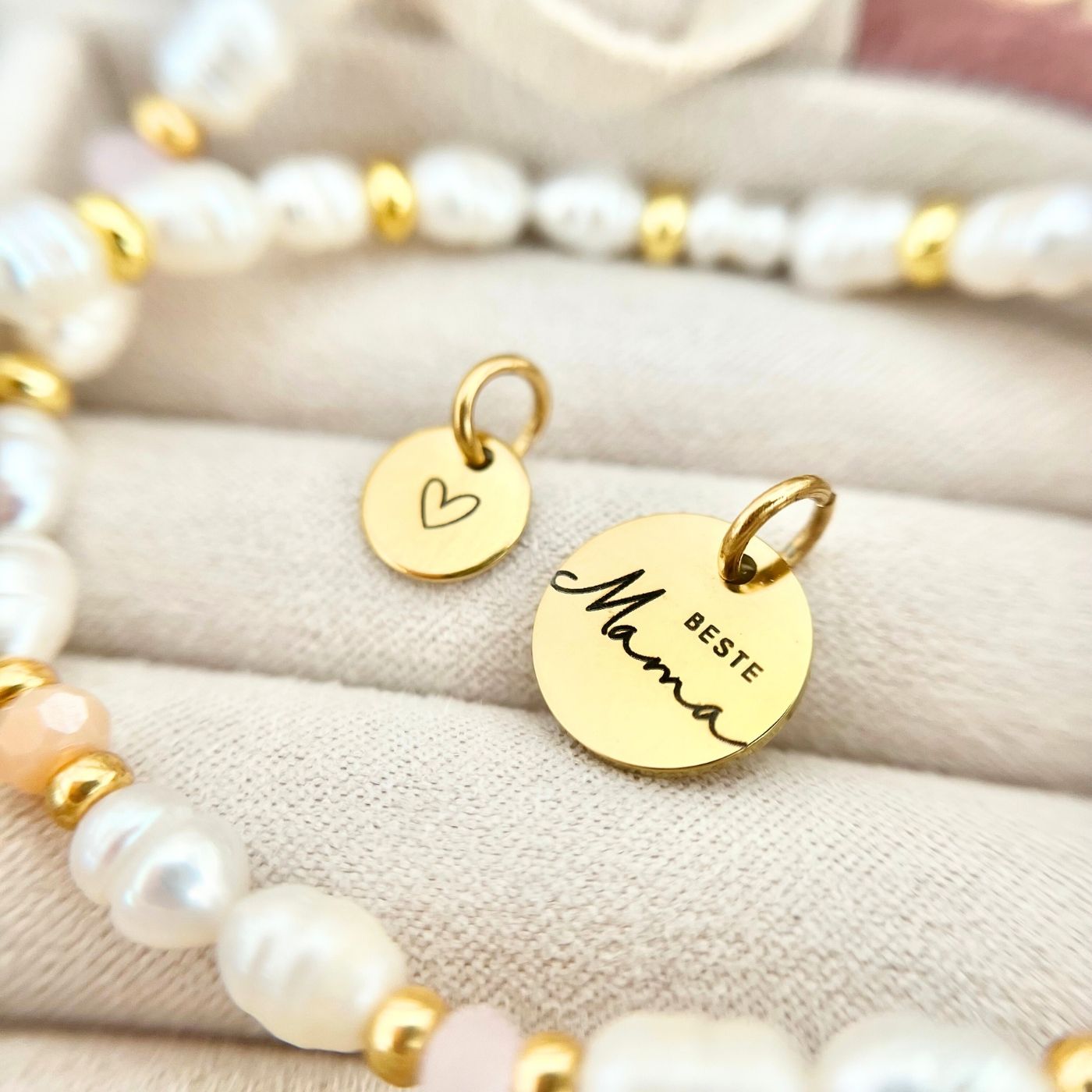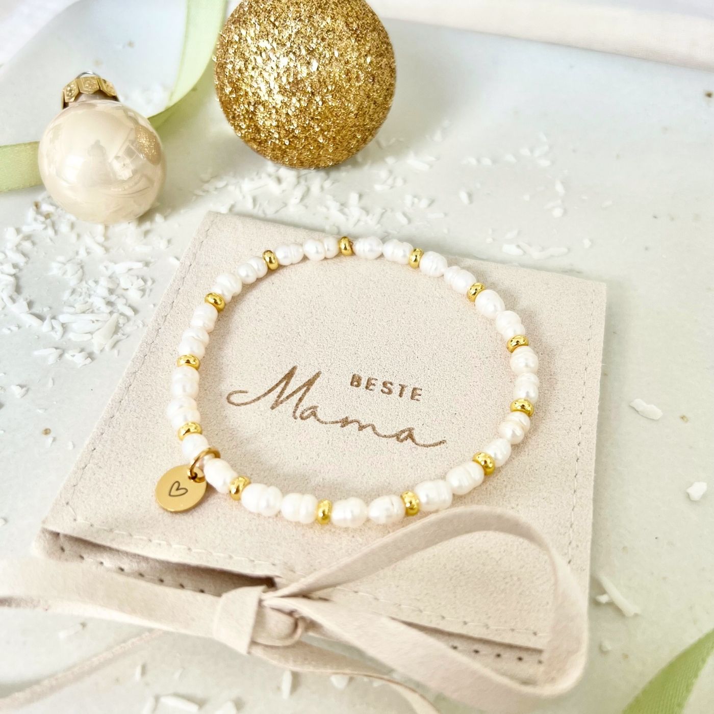 Überrasche deine Mama zu Weihnachten mit einem Schmuckstück voller Bedeutung und Eleganz. Dieses edle Armband ist handgefertigt aus echten Süßwasserperlen und 18k vergoldeten Elementen. Das Highlight ist der runde Gravur-Anhänger aus Edelstahl, wahlweise mit der Aufschrift „Beste Mama“, „Mama“ oder einem zarten Herzsymbol – ein Zeichen deiner Dankbarkeit und Liebe.
